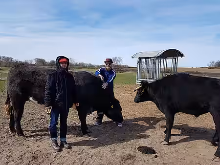 Heute waren Verena und Paule, eigentlich Paten von unserem Puter "Karl", zu Besuch. Da Karl sich nicht so gern kuscheln lässt, haben Verena und Paule unsere beiden Rinder Isabella und Pauli gekuschelt und gebürstet.