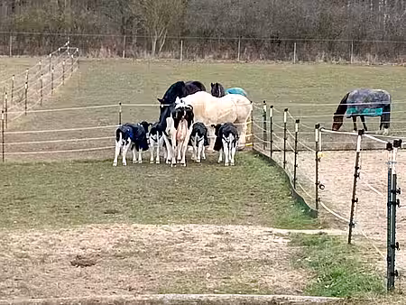 Außerdem war es heute ein besonderer Tag für unsere Vierlinge und ihre Mama Aurelia: Der Boden ist endlich weich und aufgetaut – und so konnte die kleine Familie zum ersten Mal ihren Unterstand verlassen. Sie wurden neugierig und freundlich von unseren Pferden begrüßt.