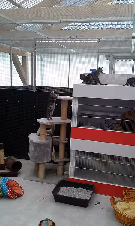 Der sehr zutrauliche Kater und die zehn Katzenbabys haben wir alle auf dem Lottihof in unserer neuen Quarantäneanlage untergebracht. Jetzt warten hier elf Katzen auf ein neues schönes Zuhause. Einige der Katzenwelpen müssen sich noch an den Menschen gewöhnen, was aber zum Glück mit viel Geduld bei jungen Katzen noch möglich ist.