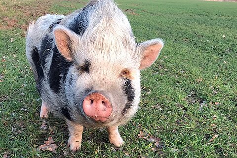 Eine Frau wurde auf das Schicksal des umherirrenden Schweins aufmerksam und bemühte sich dann über viele Monate hinweg, das clevere Tier einzufangen. Schließlich gelang es ihr und so kam Hugo zu uns auf den Lottihof, wo er bleiben darf, nachdem er sich so lange alleine durchschlagen musste.