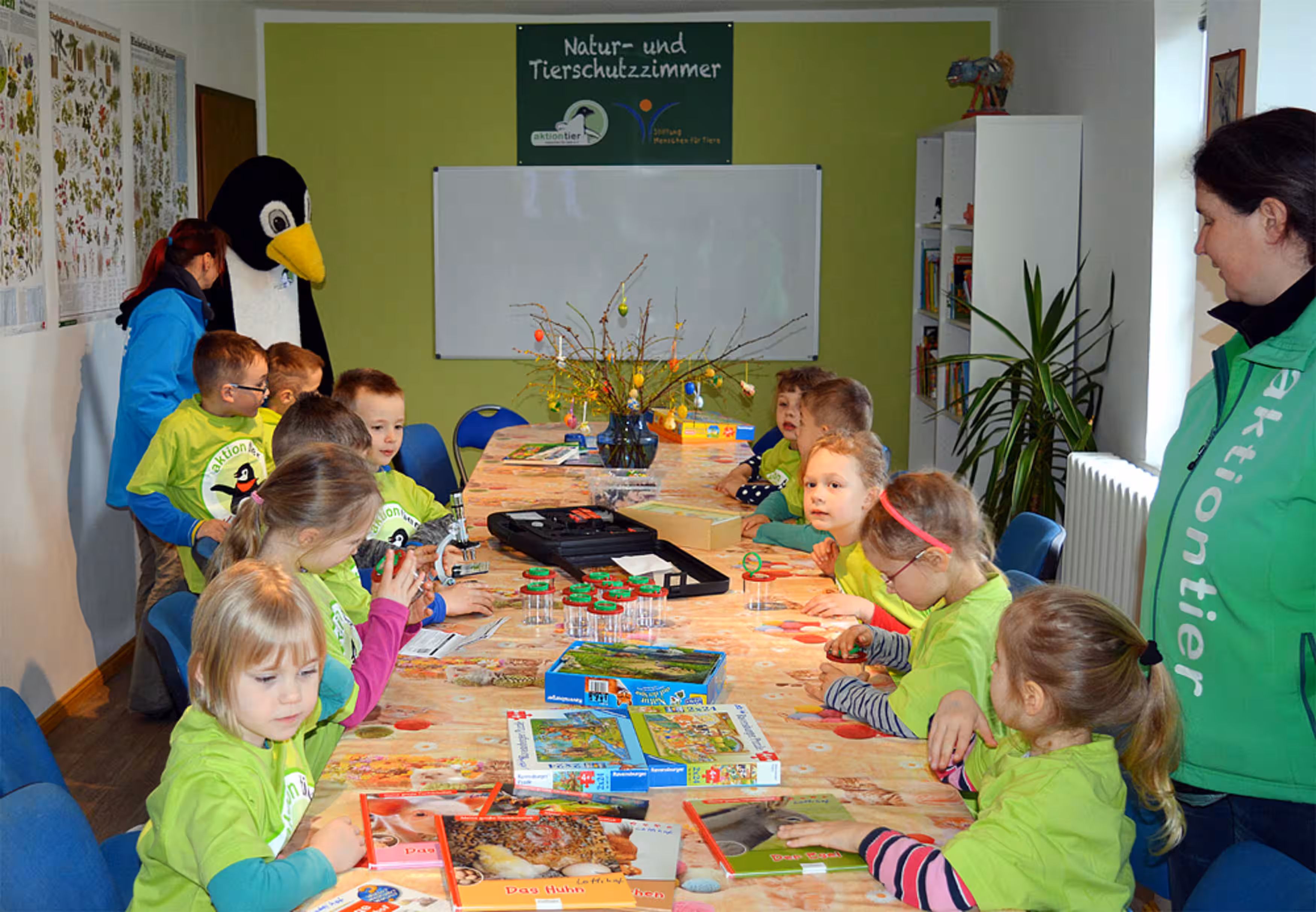 Kindergruppen sind bei uns auf dem Lottihof herzlich willkommen. Mithelfen im Stall, die Pflege der Tiere aber auch Tierschutzunterricht im hofeigenen Tierschutzzimmer gehören zu einem Tag auf dem aktion tier-Lottihof dazu.