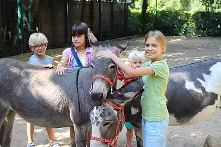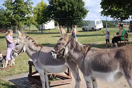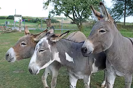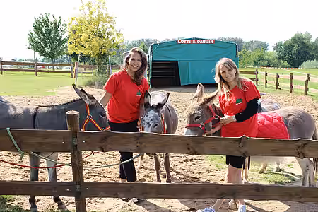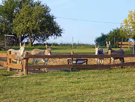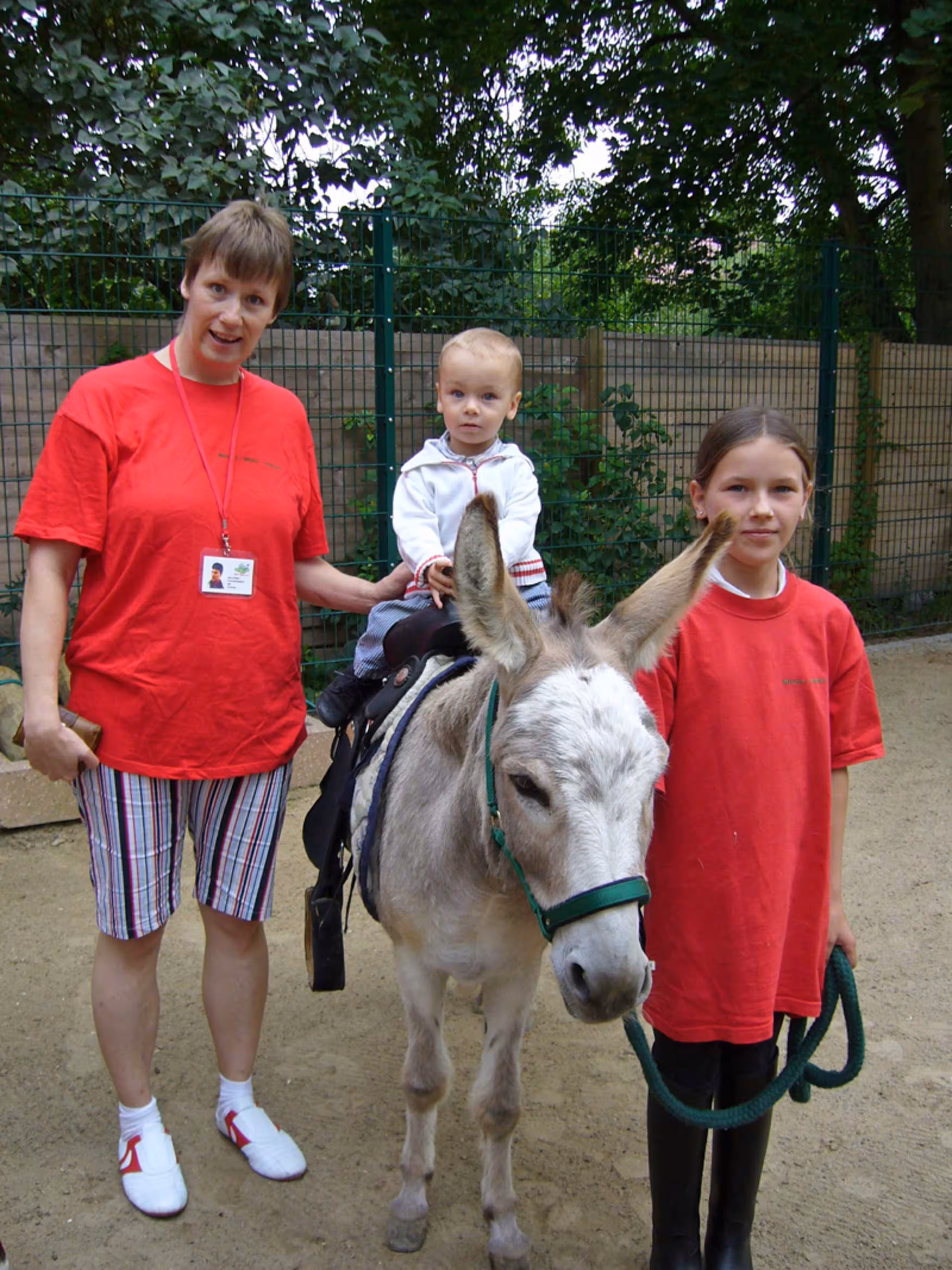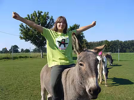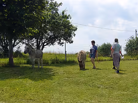 Die Eselherde macht den Kindern viel Freude. Auch wenn die "Arbeit als Therapieesel" praktisch vorbei ist, freuen sich Lotti und Darwin, wenn sie ab und an ganz langsam noch ein paar leichte Kinder über die Wiese tragen dürfen. Ansonsten werden die Esel bei uns viel geputzt, gestreichelt und genießen ein ruhiges Leben in der Herde. Wir hoffen, noch viele schöne Jahre mit ihnen vor uns zu haben.